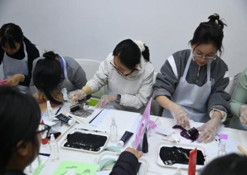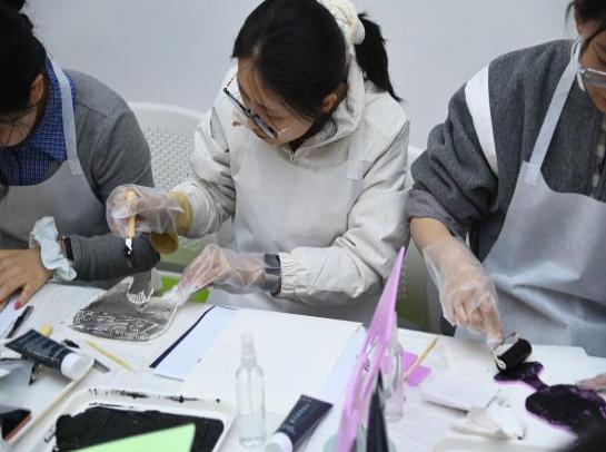 取一张干净白纸轻轻覆于模板之上,同学们手持马莲,均匀施压、缓慢摩挲。过程中,大家屏息凝神,生怕错过图案显现的瞬间。当缓缓揭开纸角,清晰的纹样完整跃然纸上时,大家发出由衷惊叹,现场满是欢笑,这一刻,大家切实感受到拓印艺术的独特魅力与创作的成就感。