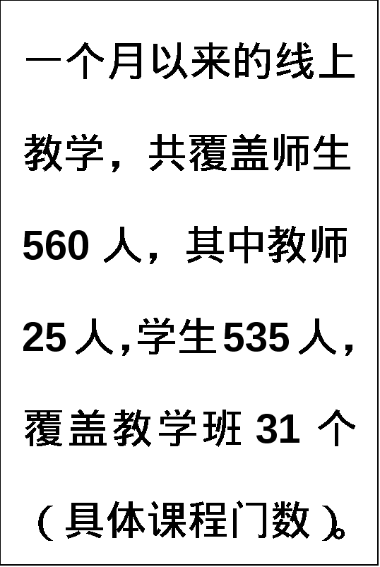 总之,我们在克服重重困难的基础之上,如期完成了一个月的线上教学工作任务。接下来,我们就需要在掌握线上课堂教学基本要求的基础之上,更好地去提高线上课堂教学质量,以便能更好地实现“停课不停教、不停学”的工作总目标。