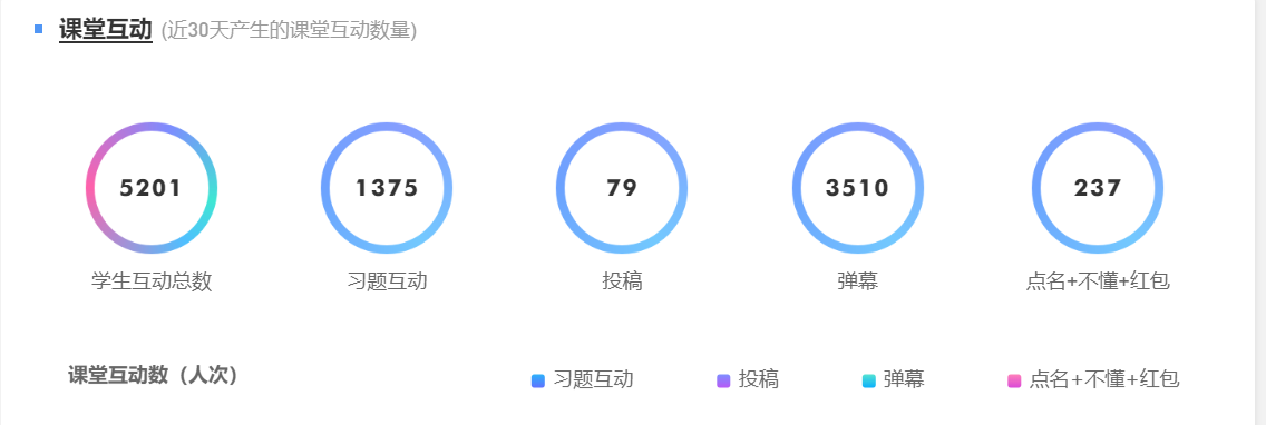 学生互动总数为5201,其中习题互动为1375,投稿为79,弹幕为3510,其余237。