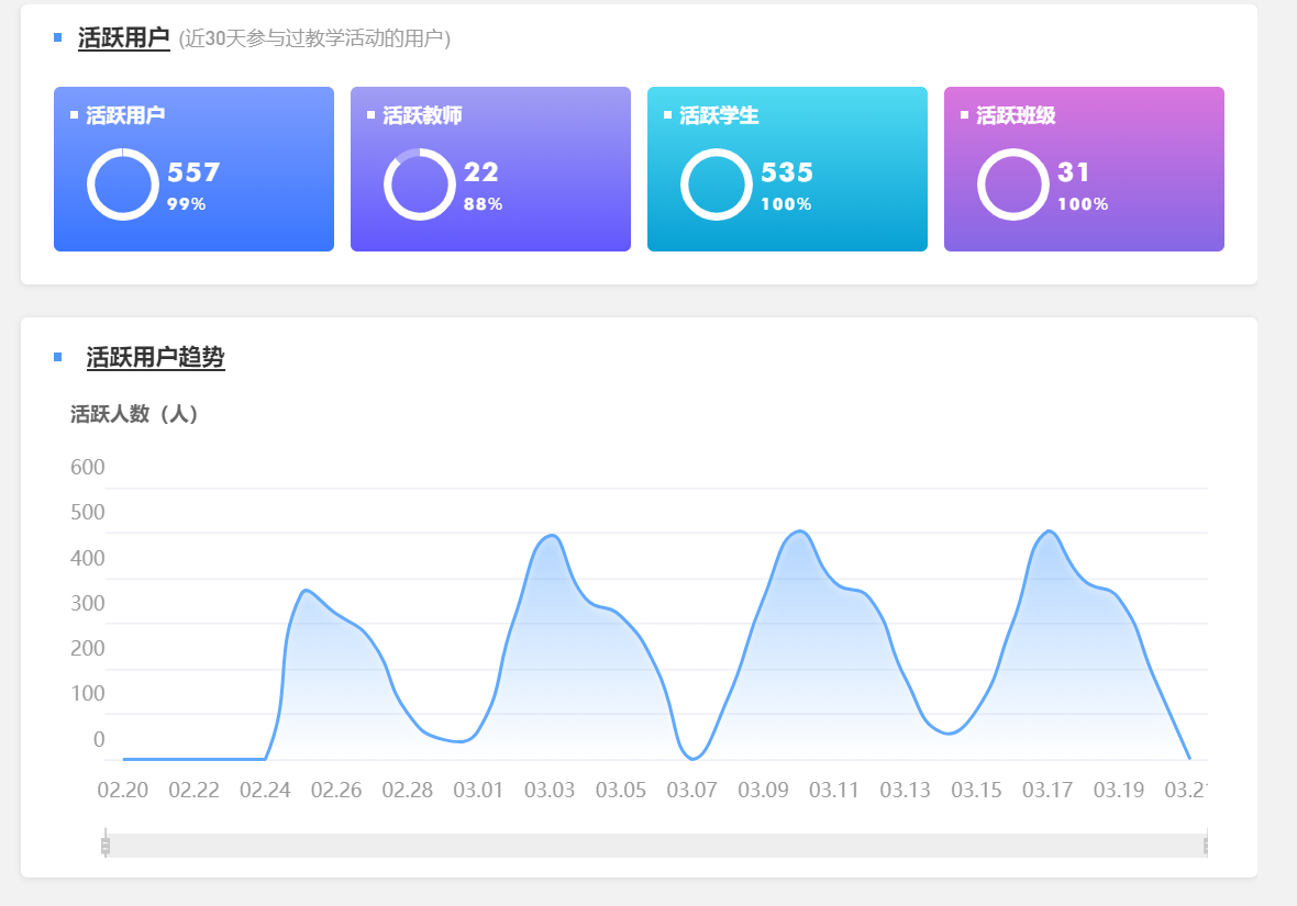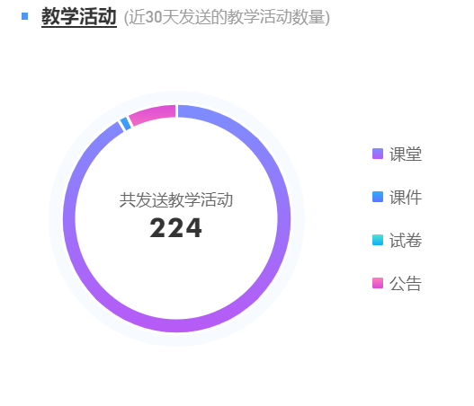 课堂总数、课件、试卷及公告的统计数据如下: