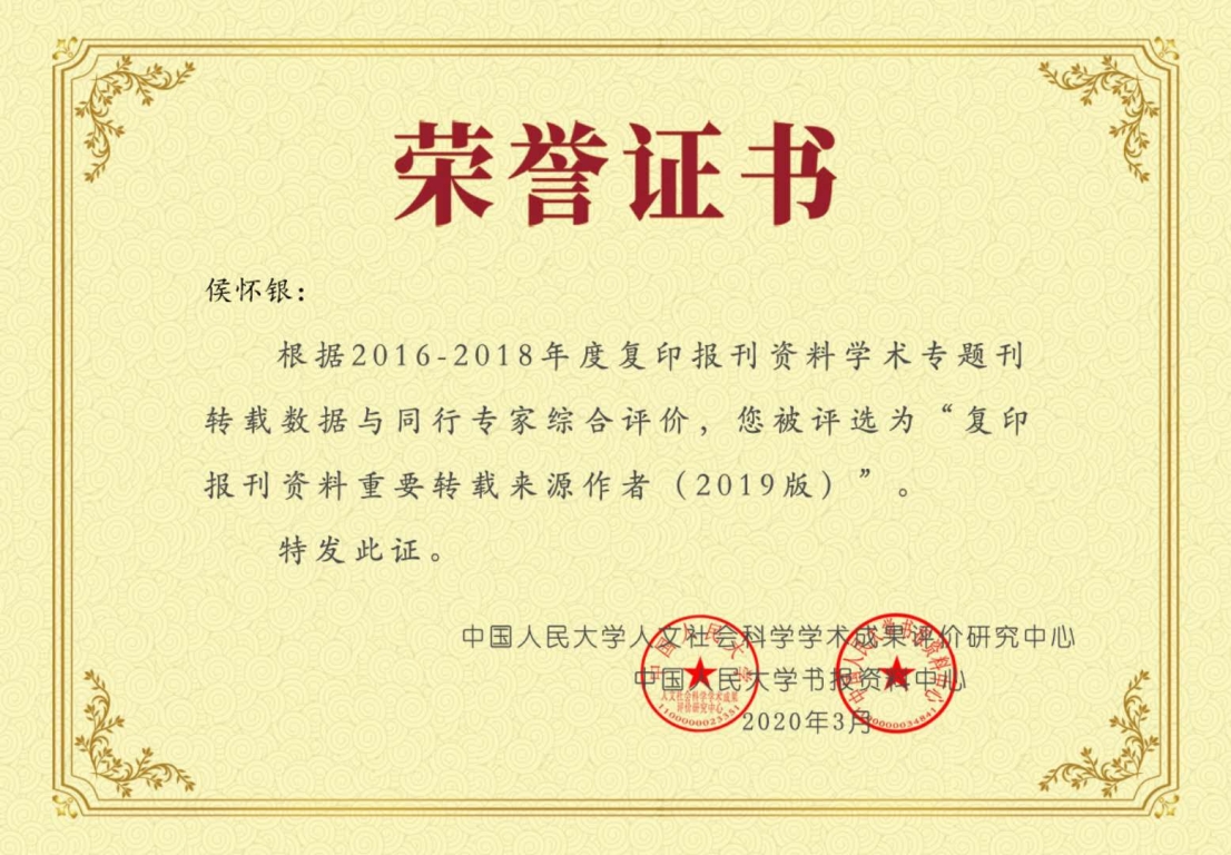 2020年3月31日,中国人民大学社会科学学术成果评价研究中心联合中国人民大学书报资料中心研制的《复印报刊资料重要转载来源作者(2019版)》成果面向社会正式发布。