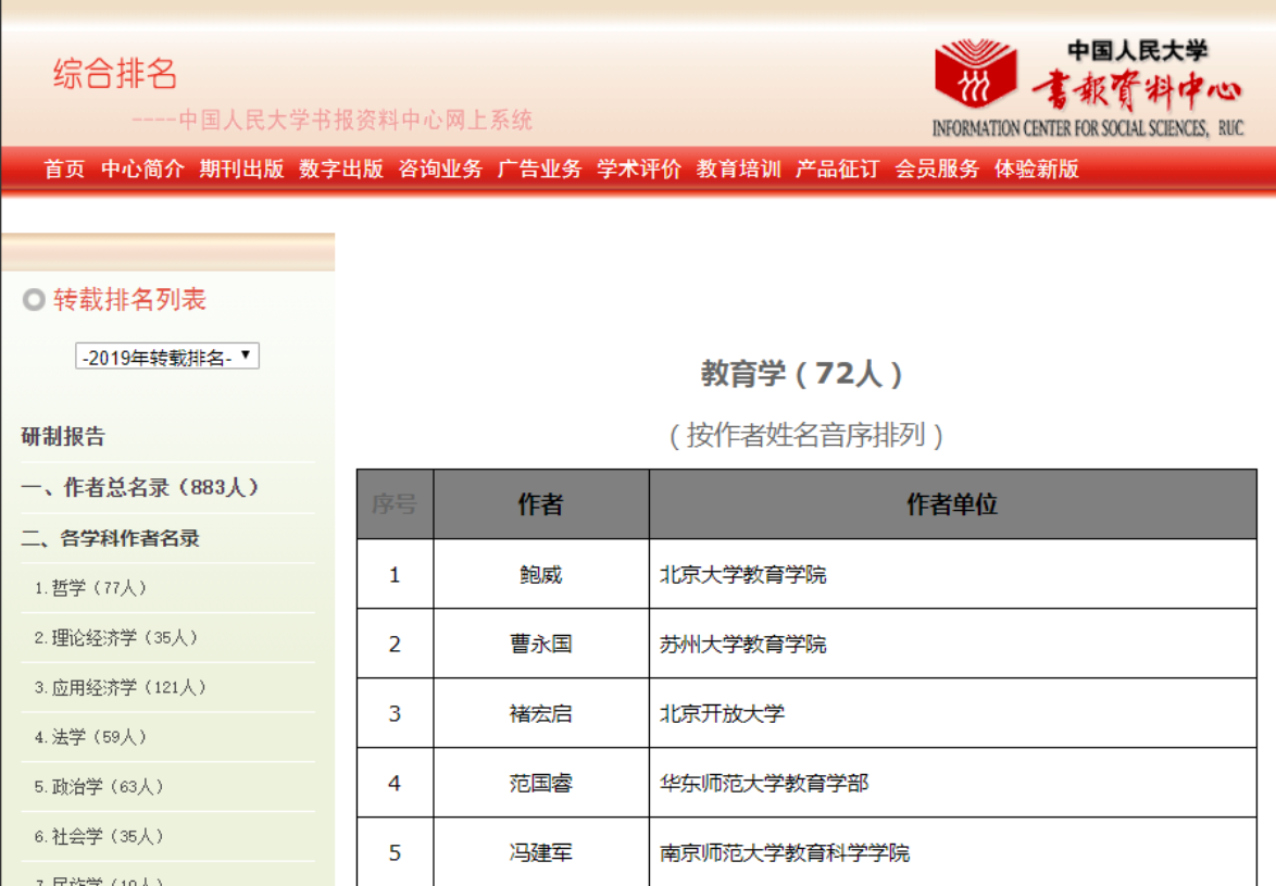 《复印报刊资料重要转载来源作者(2019版)》依据2016年—2018年间的转载数据和同行专家评议结果,最终遴选出883名人文社科学者入选。